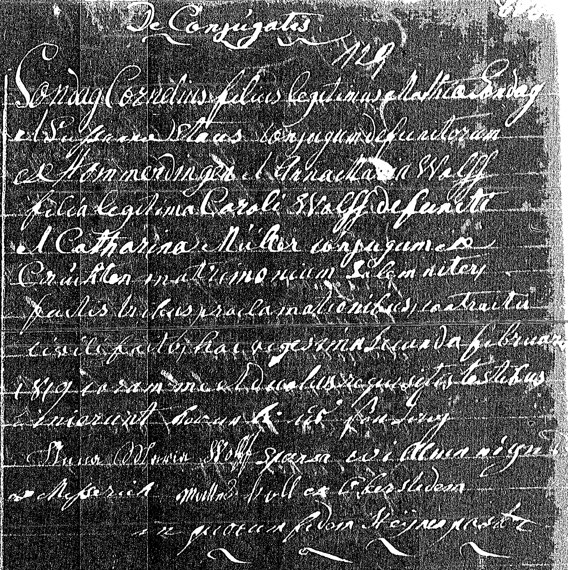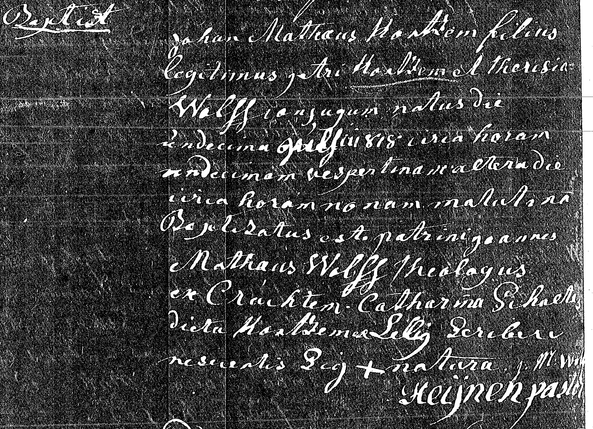 Recently, Michelle, Paula, and I decided to further our Konzen search by ordering some German microfilms of parish records through the LDS Family Search center. We ordered films for Kruchten, Konzen, Ralingen, and Fohren, Germany. So far, I’ve gone through the Kruchten film searching for more records of Theresa, Peter, and their families. I’ve found a number of records for Kouts and Wolffs and a baptism record for Johan Mathias Konzen. According to the record, Johan Mathias is the son of Peter & Theresa and his birth date matches up with the information we have on the Mathias Konzen we’ve suspected of being another of Peter & Theresa’s kids.