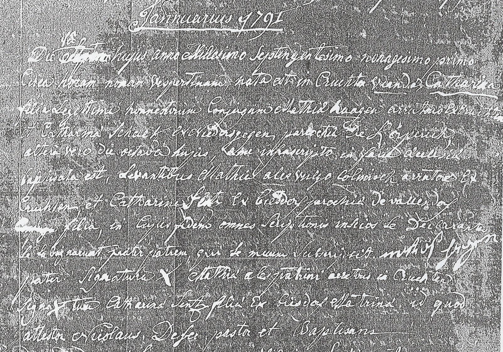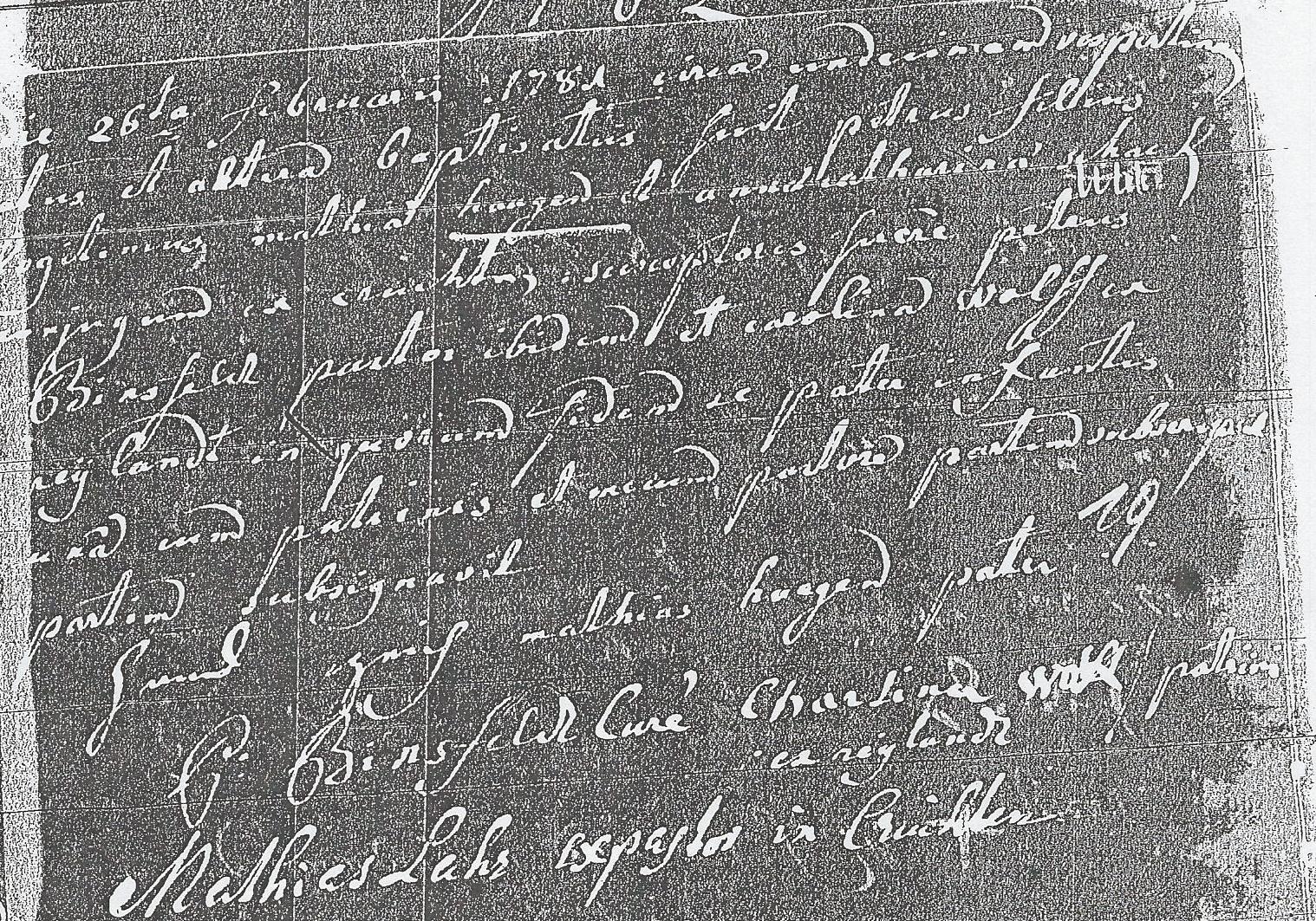 While scouring the Kruchten records for Angela, I came across two baptism records for children of Mathias Konzen and Catherine (or Anna Catherine) Schaetz. Mathias & Catherine are not Peter’s parents since since (according to his marriage record) his parents are Theodore Konzen and Catherine Schuler. Mathias’s last name is not obviously Konzen from looking at those baptism records, but in Peter & Theresa’s son Johan Mathias’s baptism record, one of his sponsors is Catherine Schaetz-Konzen which confirms that Catherine Schaetz’s husband Mathias’s last name is Konzen. So Mathias Konzen might be Peter’s uncle and his children Peter (1781) and Catherine (1791) would be Peter’s cousins.