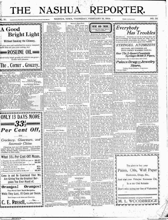 The Nashua Reporter reported in the Feb. 18, 1904, issue that “W.L. Darrow accompanied Mrs. P.H. Konzen to Marshalltown Sunday where Mrs. Konzen was notified she would meet her husband and fix up their business matters. For some reason Mr. Konzen failed to keep the appointment but informed them that he would be there very soon. Both Mr. D. and Mrs. K. are still, at this writing, in Marshalltown and but little is known about the matter at this time. Later: A telephone message from Mr. Darrow informs us that he has met Konzen and will be home Thursday. No facts as to any settlement of business has yet been received.”