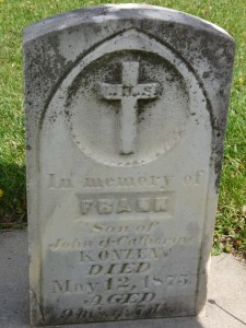 Then down a gravel road, we went to Reilly Ridge. From the Iowa WPA graves index we knew that John & Katherine Konzen were buried in Mount Calvary Cemetery (also known as St. Joseph’s Cemetery) in New Hampton, but we were hoping that their kids who died in childhood were buried at Reilly Ridge. Sandy had heard a rumor that Frank Konzen was buried in Reilly Ridge, so before our trip I wrote to Reilly Ridge and I received a reply from Jack Sabelka, one of the cemetery directors. Jack sent me a partial map of the cemetery showing the Konzen plot, but no records of who is buried in the plot. At Reilly Ridge, we wandered around for a bit (because of course I left the map in the car) before one of us finally stumbled upon Frank Konzen and then Ellen Konzen, but no Katherine or Theresa Konzen which is confusing. It’s a little odd for someone to be buried in a different cemetery than their children (who died during childhood) are buried, but is much stranger for them to have only two of their kids buried together. At the time, we didn’t think about this too much, believing that we’d probably find Katherine and Theresa together somewhere else.