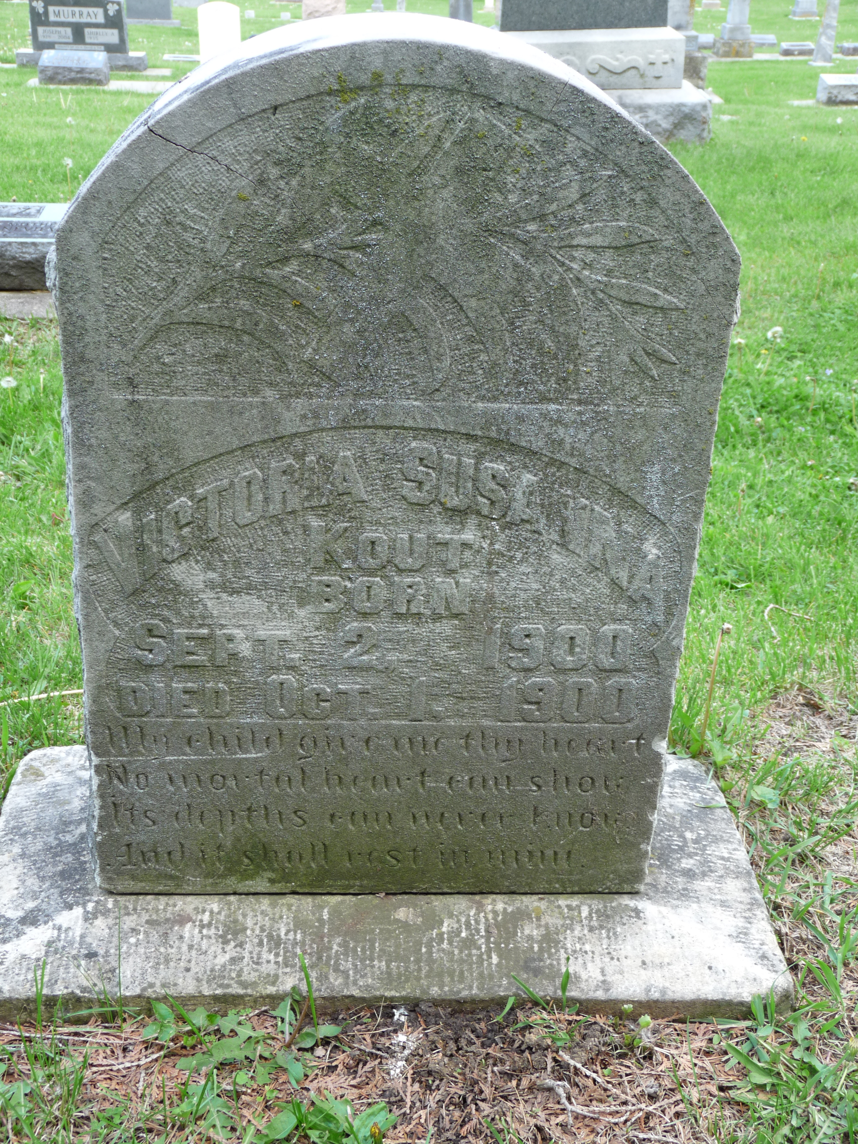 Victoria Susanna Kout, daughter of Peter & Anna Gilbert Kout, was born 2 Sep 1900 in Stapleton, Chickasaw, Iowa, and she died 1 Oct 1900 in Chickasaw, Iowa.