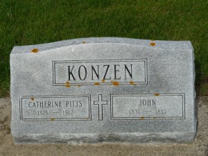 Our second day in Chickasaw county was much more complicated than we expected it to be. We started our day at Calvary Cemetery (also known as St. Joseph’s) in New Hampton. There we found my great great grandparents (also Sandy’s great great grandparents) John Konzen and Katherine Pitz Konzen and we also found Katherine’s brother John Pitz (1842-1925), Mary Konzen and Casper F. Leichtman, Emma A. Konzen and William J. Smith, and their families.