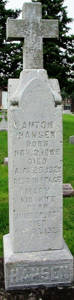 In Balltown’s cemetery not only did we find Angela Susanna Konzen & Peter Hansen, but we also found Peter P Breitbach & his wife Anna C Schmitt (Their son Benjamin Breitbach married Katherine Meyer, the granddaughter of Catherine Konzen & Anton Meyer); Jacob Breitbach & his wife Philomena Sigwarth; Rose Marie Habel (Great granddaughter of Angela Susanna Konzen & Peter Hansen); Anastasia Hansen and her brothers Anton M Hansen & Leo F Hansen (Grandchildren of Angela Susanna Konzen & Peter Hansen); Anna Maria Hansen & her sister Frances Catherine Hansen (Grandchildren of Angela Susanna Konzen & Peter Hansen); Anton Hansen (Angela Susanna Konzen & Peter Hansen’s son) & his wife Mary Theresa Neises; Clemens Hansen (Angela Susanna Konzen & Peter Hansen’s son) & his wife Elizabeth Mary Neises; Alfred Jaeger (Mathias Jaeger & Regina Meyel’s son); Eva Meyer (Daughter of Catherine Konzen & Anton Meyer), her husband John Jaeger, and his second wife Margaretha Conrad (Catherine Konzen & Anton Meyer’s granddaughter); Henry Jaeger (Nicholas Jaeger & Mary Blide’s son) & his wife Mary Meyer (Granddaughter of Catherine Konzen & Anton Meyer); William Jaeger (Son of John Jaeger & Margaretha Conrad); Andrew Link (His great granddaughter Mildred Mary Link married Anthony Jaeger); Frank J Link & his wife Catherine Mary Sigwarth (Louis Sigwarth & Catherine Hansen’s daughter, Angela Susanna Konzen & Peter Hansen’s daughter); Francis Link (William Link & Maria Breitbach’s son) & his wife Margaret Thul; Silverius Link (Son of John Link & Cecilia Hansen, Angela Susanna Konzen & Peter Hansen’s granddaughter); Matthias Loch & his wife Mary Hansen (Angela Susanna Konzen & Peter Hansen’s daughter); Francis Sigwarth & his sister Irene Sigwarth; and George Steger & his wife Mary Sigwarth (Daughter of Catherine Hansen & Louis Sigwarth).