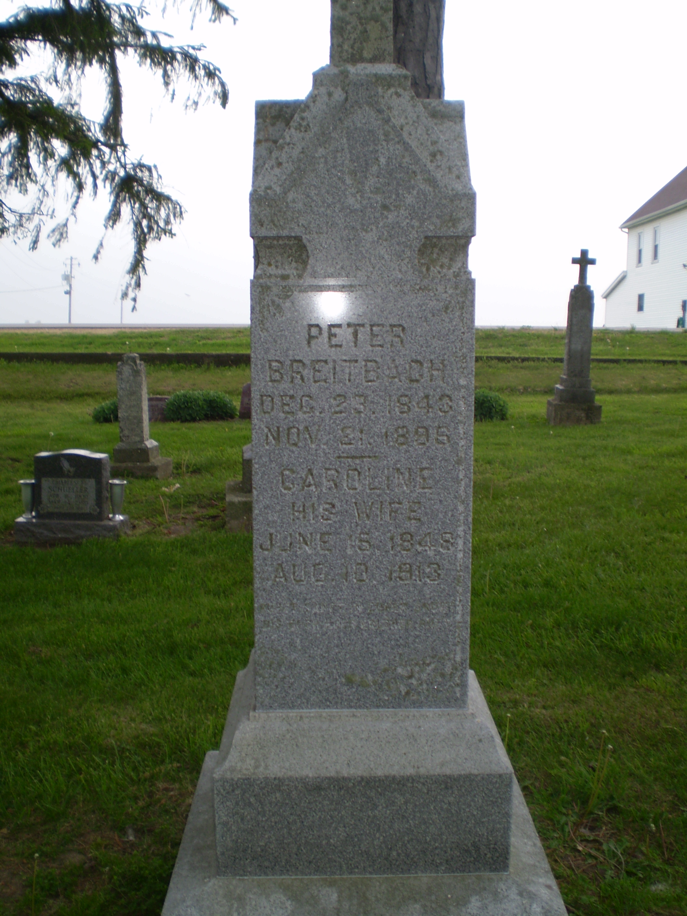 In Sherrill’s Sts. Peter & Paul Cemetery, we found Mathias Neises & his wife Maria (Their daughter Mary Theresa Neises married Anton Hansen, Angela Susanna Konzen’s son), Peter Breitbach & Caroline Sigwarth (Their son Peter Breitbach married Anna Katherine Ries) and her parents Ludwig & Dorothea Sigwarth, and Mathias Brimeyer (Great grandfather of Marie Margaret Brimeyer who married Herbert Hansen, Angela Susanna Konzen’s grandson).