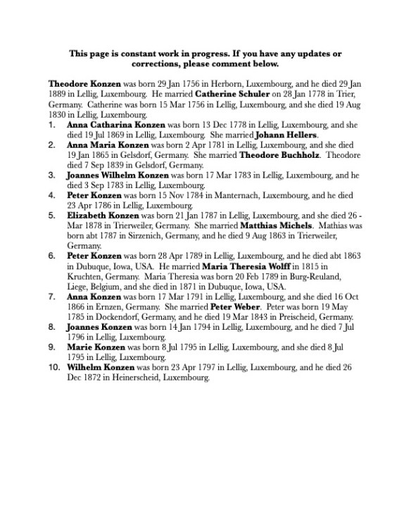 Hi! My name is Rene Funke and my grandmother was Isabelle Konzen, descendant of Theodore then Anthony. I was so excited to find your site! Thank you so much for putting it together! There are a few missing children (my cousins). Let me know if you would like that info. Thanks!