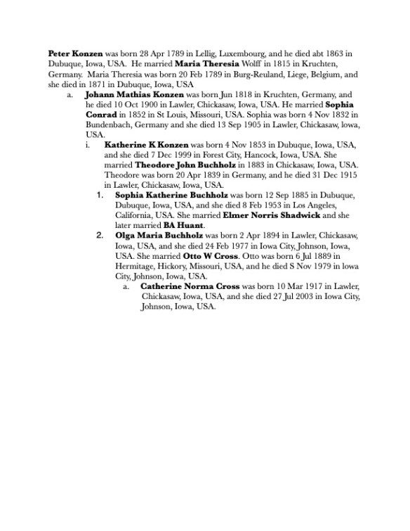 Thanks, Mary! I have a lot more done on the family tree, but I haven’t gotten around to entering the rest of it on the blog, yet. I’m sorry to hear about your mom. So you’re descended from Theodore (I’m descended from Joannes/John), do you know Michelle Huss? Michelle’s also descended from Theodore and she’s one of the girls I do genealogy with. I’m glad you like the blog. When I first started doing genealogy, I had a horrible time finding information on most of my lines, but somebody on one side of my family had posted a family tree on a website. That family tree gave me a lot of help, so I thought it would be a great idea to have something like this for the Konzens because they have been so difficult to find.